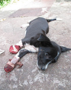 Aus den Vorderbeinen des kleinen Hundes floss viel Blut, das die Mutter mit ihrer Zunge aufzulecken versuchte. Die kleinen Beinchen waren schwer verwundet oder teilweise abgetrennt, so genau konnte ich das wegen des Blutes und der unzähligen Fliegen, die um das Hündchen herumschwirrten, nicht sehen. Die Umherstehenden beobachteten das Ganze und gingen dann mit traurigem Gesichtsausdruck ihrer Wege. Niemand kam auf die Idee, etwas zu unternehmen.